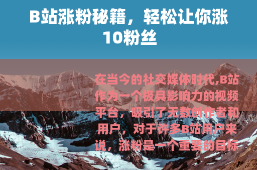 在当今的社交媒体时代,B站作为一个极具影响力的视频平台,吸引了无数创作者和用户,对于许多B站用户来说,涨粉是一个重要的目标,今天就来给大家分享一些实用的方法,帮助你在B站轻松涨10粉丝。 质量是关键,要确保你的视频具有独特性和吸引力,无论是搞笑、知识科普、美食制作还是游戏攻略等各种类型,都要在众多同类视频中脱颖而出,投入足够的时间和精力去策划、拍摄和剪辑,让观众在观看你的视频时有良好的体验,从而更愿意关注你。