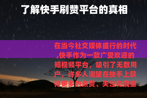 在当今社交媒体盛行的时代,快手作为一款广受欢迎的短视频平台,吸引了无数用户,许多人渴望在快手上获得更多的点赞、关注和流量,以提升自己的影响力和知名度,快手刷赞平台应运而生。