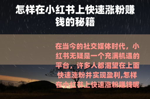 在当今的社交媒体时代,小红书无疑是一个充满机遇的平台,许多人都渴望在上面快速涨粉并实现盈利,怎样在小红书上快速涨粉赚钱呢?