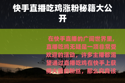 在快手直播的广阔世界里,直播吃鸡无疑是一项非常受欢迎的活动,许多主播都渴望通过直播吃鸡在快手上获得大量的粉丝,那么究竟该如何实现呢?以下是一些实用的方法。