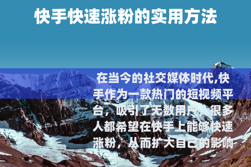 在当今的社交媒体时代,快手作为一款热门的短视频平台,吸引了无数用户,很多人都希望在快手上能够快速涨粉,从而扩大自己的影响力和获得更多的机会,以下是一些可以帮助你在快手上快速涨粉的方法。