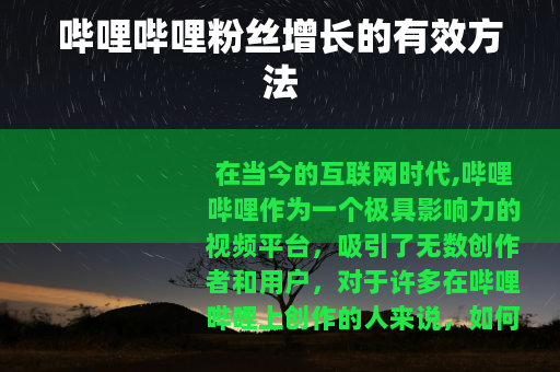 在当今的互联网时代,哔哩哔哩作为一个极具影响力的视频平台,吸引了无数创作者和用户,对于许多在哔哩哔哩上创作的人来说,如何增长粉丝是一个至关重要的问题,以下是一些能够帮助你在哔哩哔哩上增加粉丝的有效方法。 质量是关键,要确保你发布的视频具有独特性、趣味性和实用性,无论是搞笑、知识科普、美食制作还是游戏攻略等各种类型的视频,都要在内容上做到精益求精,如果你制作知识科普类视频,要确保所传达的信息准确无误,并且以一种通俗易懂、生动有趣的方式呈现给观众,这样才能让观众在观看你的视频后有所收获,从而更愿意关注你,成为你的粉丝。
