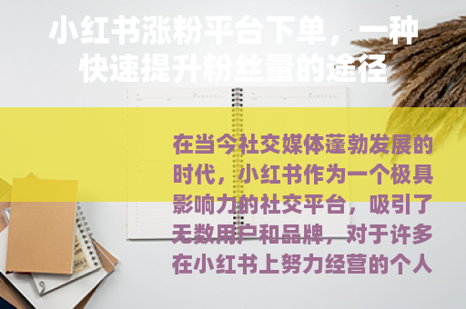 在当今社交媒体蓬勃发展的时代,小红书作为一个极具影响力的社交平台,吸引了无数用户和品牌,对于许多在小红书上努力经营的个人和商家来说,拥有大量的粉丝是实现更大影响力和商业价值的关键,小红书涨粉平台下单这一方式逐渐进入了人们的视野。