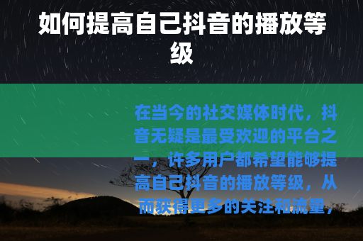 在当今的社交媒体时代,抖音无疑是最受欢迎的平台之一,许多用户都希望能够提高自己抖音的播放等级,从而获得更多的关注和流量,究竟该怎么做呢? 质量是关键,要确保你的视频具有独特性和吸引力,可以从自己的兴趣爱好、专业技能或生活中的有趣经历出发,制作出能够引起观众共鸣的视频,如果你擅长烹饪,那么可以分享一些独特的食谱或烹饪技巧;如果你喜欢旅行,就可以记录下旅途中的美景和有趣的故事。
