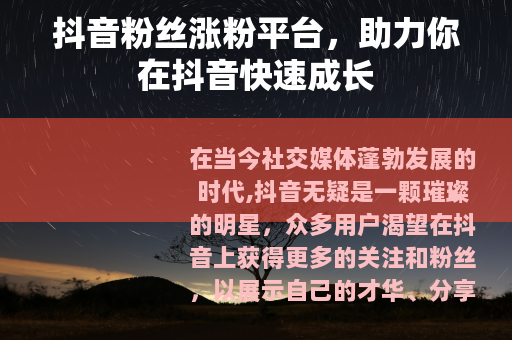 在当今社交媒体蓬勃发展的时代,抖音无疑是一颗璀璨的明星,众多用户渴望在抖音上获得更多的关注和粉丝,以展示自己的才华、分享生活点滴或推广自己的品牌和产品,而抖音粉丝涨粉平台的出现,为这些用户提供了一个有效的途径。