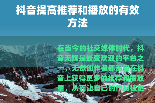 在当今的社交媒体时代,抖音无疑是最受欢迎的平台之一,无数创作者都渴望在抖音上获得更多的推荐和播放量,从而让自己的作品被更多人看到,以下是一些能够帮助你提高抖音推荐和播放的实用方法。 质量是关键,确保你的视频内容具有独特性和吸引力,无论是搞笑、知识分享、美食制作还是生活趣事,都要找到一个能让观众产生兴趣的点,在拍摄前精心策划脚本,让视频有一个清晰的主题和流畅的情节,避免内容过于杂乱无章,注意视频的画质和音质,尽量使用高清设备拍摄,保证画面清晰、稳定,声音清晰可听,这样能给观众带来更好的观看体验。