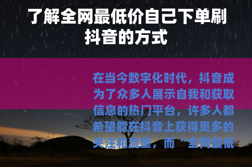 在当今数字化时代,抖音成为了众多人展示自我和获取信息的热门平台,许多人都希望能在抖音上获得更多的关注和流量,而“全网最低价自己下单刷抖音”的话题也逐渐引起了大家的兴趣。