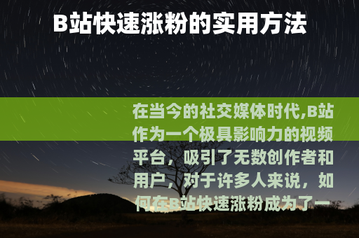 在当今的社交媒体时代,B站作为一个极具影响力的视频平台,吸引了无数创作者和用户,对于许多人来说,如何在B站快速涨粉成为了一个热门话题,以下是一些在B站涨粉较快的有效方法。 质量是关键,要制作出有吸引力、有价值的视频内容,无论是搞笑、知识科普、美食制作还是游戏攻略等各种类型,都要确保内容能够真正吸引到目标受众,在制作视频时,要注重画面的清晰度和稳定性,良好的视觉效果能够让观众更愿意停留观看,音频的质量也不能忽视,清晰的声音和合适的背景音乐可以增强视频的氛围和感染力。