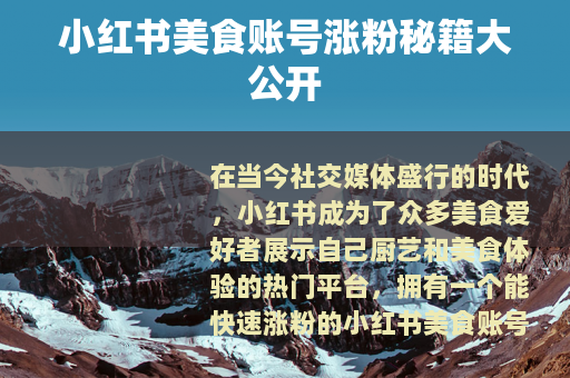 在当今社交媒体盛行的时代,小红书成为了众多美食爱好者展示自己厨艺和美食体验的热门平台,拥有一个能快速涨粉的小红书美食账号,无疑是许多人的梦想,如何才能让自己的小红书美食账号实现涨粉呢?