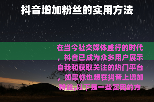 在当今社交媒体盛行的时代,抖音已成为众多用户展示自我和获取关注的热门平台,如果你也想在抖音上增加粉丝,以下是一些实用的方法。