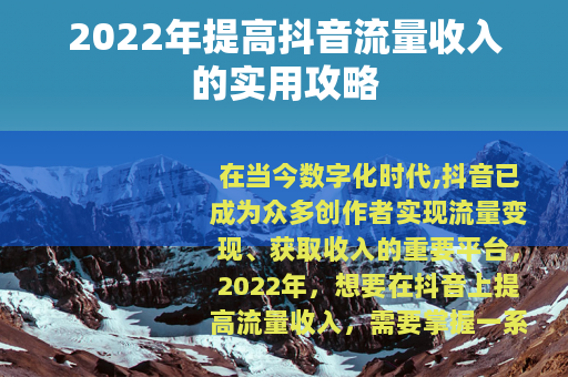在当今数字化时代,抖音已成为众多创作者实现流量变现、获取收入的重要平台,2022年,想要在抖音上提高流量收入,需要掌握一系列有效的策略和方法,以下是一些关键要点,助你在抖音的流量海洋中乘风破浪,实现收入的增长。