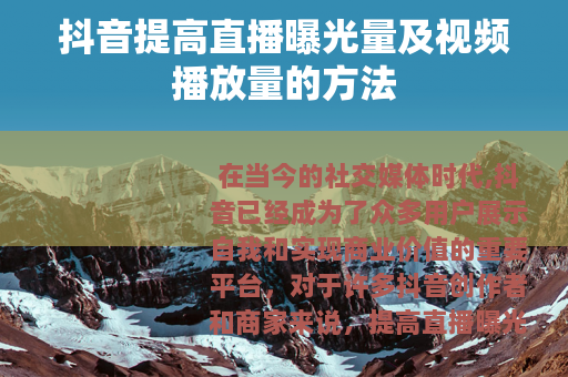 在当今的社交媒体时代,抖音已经成为了众多用户展示自我和实现商业价值的重要平台,对于许多抖音创作者和商家来说,提高直播曝光量以及视频播放量是他们最为关注的问题之一,以下是一些有效的方法,可以帮助你在抖音上实现这一目标。