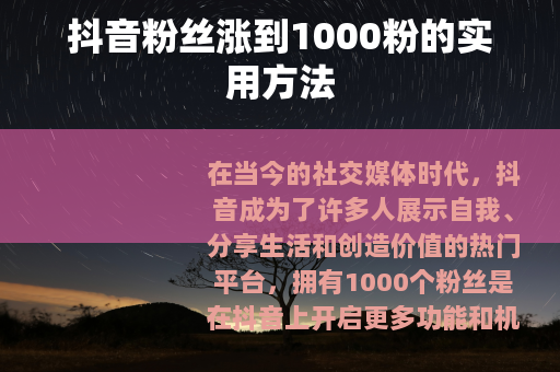 通过以上这些方法的综合运用,你就能够在抖音上逐步积累起自己的粉丝群体,实现粉丝量突破1000粉的目标,在抖音的世界里开启属于自己的精彩篇章。