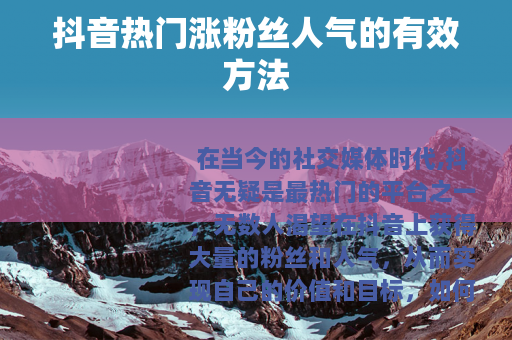 在当今的社交媒体时代,抖音无疑是最热门的平台之一,无数人渴望在抖音上获得大量的粉丝和人气,从而实现自己的价值和目标,如何才能在抖音上成功涨粉,提升人气呢?以下是一些实用的方法。