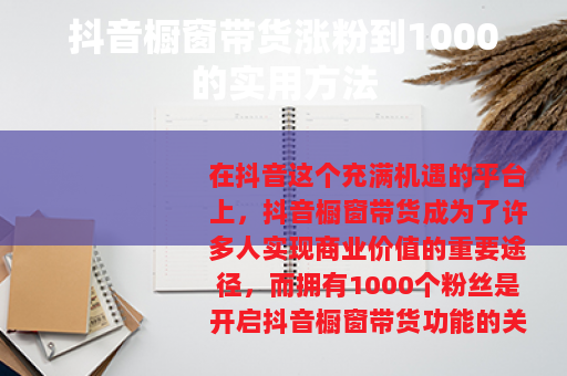 通过以上这些方法的综合运用,只要你坚持不懈地努力,就有很大机会在抖音上成功涨粉到1000,开启自己的抖音橱窗带货之路,在这个充满活力的平台上实现自己的商业目标。