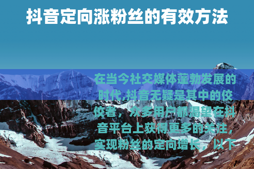抖音定向涨粉丝需要通过精心的内容创作、巧妙利用平台功能、积极互动以及保持稳定的发布频率等多方面的努力,只要坚持不懈地去实践这些方法,相信在抖音平台上实现粉丝的定向增长并不是一件难事,能够让你的抖音账号在众多用户中脱颖而出,收获更多的关注和喜爱。