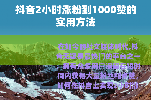 在如今的社交媒体时代,抖音无疑是最热门的平台之一,拥有众多用户渴望在短时间内获得大量粉丝和点赞,如何在抖音上实现2小时涨粉丝涨到1000赞呢?以下是一些实用的方法。