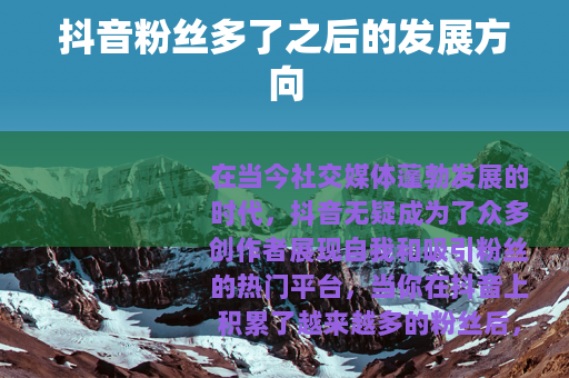当抖音粉丝多了之后,有着众多的发展方向和可能性,关键在于要明确自己的目标和定位,充分发挥自己的优势和特长,不断创新和尝试,以实现个人价值和商业价值的双赢,在抖音这个充满机遇的平台上创造出更加辉煌的成就。