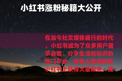 在当今社交媒体盛行的时代,小红书成为了众多用户展示自我、分享生活和知识的热门平台,很多人都渴望在小红书上获得大量粉丝,提升自己的影响力,小红书怎么涨粉呀?下面就为大家分享一些实用的方法。