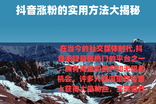 在当今的社交媒体时代,抖音无疑是最热门的平台之一,拥有海量的用户和无限的机会,许多人都渴望在抖音上获得大量粉丝,实现自己的影响力和价值提升,抖音怎么做能涨粉丝呢?以下是一些实用的方法。