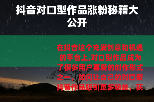 要想让自己的对口型抖音作品涨粉,需要在多个方面下功夫,不断优化和提升自己的创作水平和运营能力,相信通过努力,你一定能在抖音上收获一大批忠实的粉丝,让自己的对口型作品获得更多的喜爱和认可。