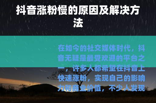 在如今的社交媒体时代,抖音无疑是最受欢迎的平台之一,许多人都希望在抖音上快速涨粉,实现自己的影响力和商业价值,不少人发现自己的抖音账号涨粉速度比较慢,这背后其实存在着多种原因。 质量是关键因素之一,如果你的视频内容缺乏新意、不够吸引人,或者制作粗糙,那么用户很可能在浏览几秒钟后就划走了,高质量的内容需要有独特的创意,能够引发用户的共鸣和兴趣,你可以通过讲述有趣的故事、分享实用的知识技能或展示精彩的才艺表演等方式,来吸引用户的关注并让他们愿意停留观看。