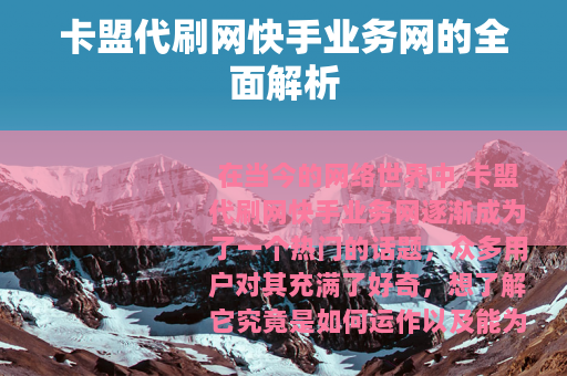 在当今的网络世界中,卡盟代刷网快手业务网逐渐成为了一个热门的话题,众多用户对其充满了好奇,想了解它究竟是如何运作以及能为自己带来哪些便利。