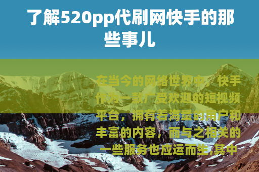 在当今的网络世界中,快手作为一款广受欢迎的短视频平台,拥有着海量的用户和丰富的内容,而与之相关的一些服务也应运而生,其中就包括520pp代刷网快手这样的平台。
