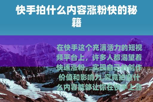 在快手这个充满活力的短视频平台上,许多人都渴望着快速涨粉,实现自己的创作价值和影响力,究竟拍些什么内容能够让你在快手上涨粉快呢?