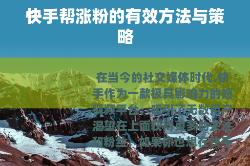 在当今的社交媒体时代,快手作为一款极具影响力的短视频平台,吸引了无数用户渴望在上面获得更多的关注和粉丝,如果你也想在快手上提升自己的粉丝数量,以下是一些实用的图文字方法可以帮助你实现这一目标。