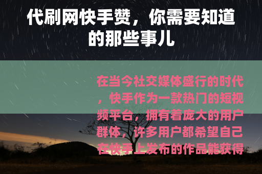 在当今社交媒体盛行的时代,快手作为一款热门的短视频平台,拥有着庞大的用户群体,许多用户都希望自己在快手上发布的作品能获得更多的点赞,以此来增加作品的热度和曝光度,在这样的需求下,代刷网快手赞的服务应运而生。