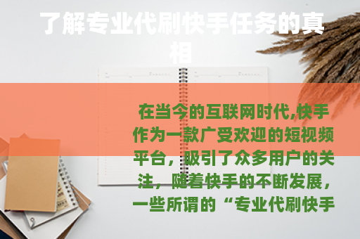 在当今的互联网时代,快手作为一款广受欢迎的短视频平台,吸引了众多用户的关注,随着快手的不断发展,一些所谓的“专业代刷快手任务”的服务也悄然出现。
