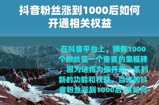 在抖音平台上,拥有1000个粉丝是一个重要的里程碑,因为这将为你开启一系列新的功能和权益,当你的抖音粉丝涨到1000后,该如何去开通相应的功能呢?