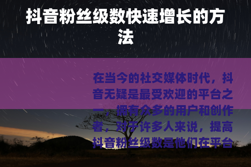 在当今的社交媒体时代,抖音无疑是最受欢迎的平台之一,拥有众多的用户和创作者,对于许多人来说,提高抖音粉丝级数是他们在平台上努力追求的目标之一,究竟有哪些有效的方法可以帮助我们实现抖音粉丝级数的快速增长呢? 质量是关键,要创作出有趣、有价值且独特的视频内容,了解你的目标受众,关注他们的兴趣点和需求,这样才能制作出能够吸引他们的视频,如果你发现你的目标受众对美食感兴趣,那么你可以制作各种美食制作教程、美食探店等相关视频,用精彩的画面和生动的解说,让观众在观看视频的过程中获得乐趣和知识,从而增加他们对你的关注和喜爱。