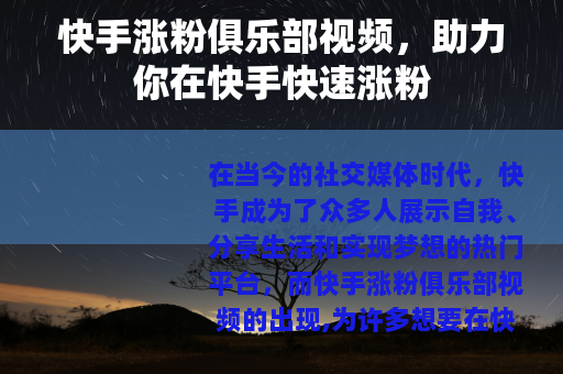 在当今的社交媒体时代,快手成为了众多人展示自我、分享生活和实现梦想的热门平台,而快手涨粉俱乐部视频的出现,为许多想要在快手上获得更多关注和粉丝的用户带来了新的机遇。