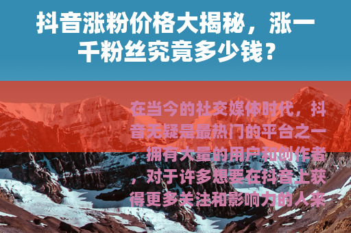 在当今的社交媒体时代,抖音无疑是最热门的平台之一,拥有大量的用户和创作者,对于许多想要在抖音上获得更多关注和影响力的人来说,粉丝数量是一个重要的指标,抖音涨一千粉丝到底需要多少钱呢?
