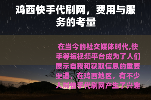 在当今的社交媒体时代,快手等短视频平台成为了人们展示自我和获取信息的重要渠道,在鸡西地区,有不少人对快手代刷网产生了兴趣,其中一个关键因素就是其声称的低费用和所谓的服务客户理念。