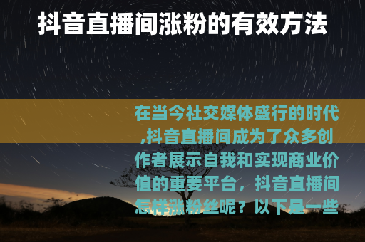 在当今社交媒体盛行的时代,抖音直播间成为了众多创作者展示自我和实现商业价值的重要平台,抖音直播间怎样涨粉丝呢?以下是一些实用的方法。