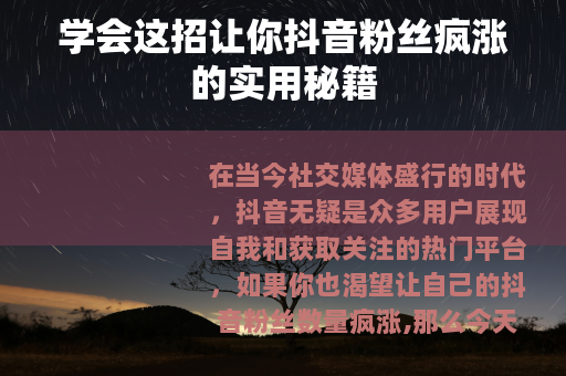 在当今社交媒体盛行的时代,抖音无疑是众多用户展现自我和获取关注的热门平台,如果你也渴望让自己的抖音粉丝数量疯涨,那么今天就为你分享一个超级实用的方法。