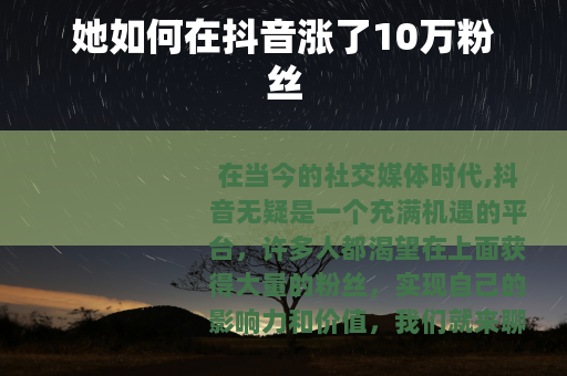 在当今的社交媒体时代,抖音无疑是一个充满机遇的平台,许多人都渴望在上面获得大量的粉丝,实现自己的影响力和价值,我们就来聊聊她是怎样在抖音涨了10万粉丝的。