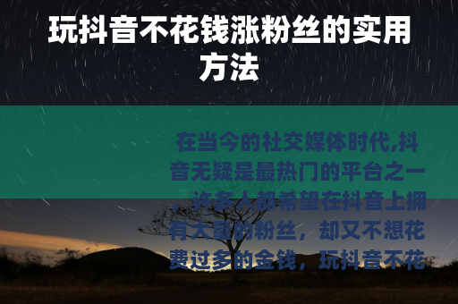 在当今的社交媒体时代,抖音无疑是最热门的平台之一,许多人都希望在抖音上拥有大量的粉丝,却又不想花费过多的金钱,玩抖音不花钱怎样才能涨粉丝呢?以下是一些实用的方法。