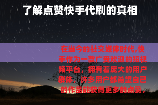 在当今的社交媒体时代,快手作为一款广受欢迎的短视频平台,拥有着庞大的用户群体,许多用户都希望自己的作品能获得更多的点赞,从而获得更多的关注和流量,有一种现象逐渐兴起,那就是所谓的“点赞快手代刷”。