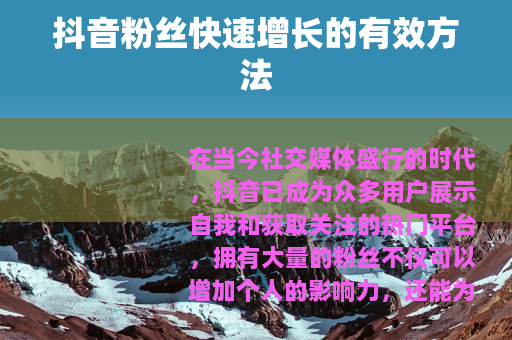 在当今社交媒体盛行的时代,抖音已成为众多用户展示自我和获取关注的热门平台,拥有大量的粉丝不仅可以增加个人的影响力,还能为商业合作等带来更多机会,抖音粉丝究竟是怎么涨的呢?以下为您详细介绍一些实用的方法。