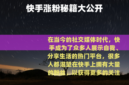 在当今的社交媒体时代,快手成为了众多人展示自我、分享生活的热门平台,很多人都渴望在快手上拥有大量的粉丝,以获得更多的关注和认可,如何在快手上快速涨粉丝呢?以下是一些实用的方法。