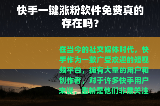 在当今的社交媒体时代,快手作为一款广受欢迎的短视频平台,拥有大量的用户和创作者,对于许多快手用户来说,涨粉是他们非常关注的一个问题,关于快手一键涨粉软件免费的话题也备受瞩目。