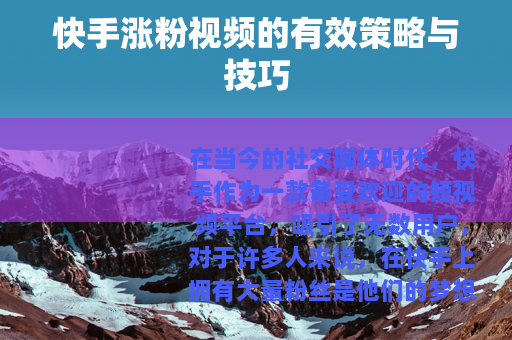 在当今的社交媒体时代,快手作为一款备受欢迎的短视频平台,吸引了无数用户,对于许多人来说,在快手上拥有大量粉丝是他们的梦想,而快手涨粉视频则成为了实现这一梦想的关键。