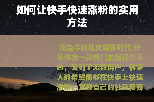 在当今的社交媒体时代,快手作为一款热门的短视频平台,吸引了无数用户,很多人都希望能够在快手上快速涨粉,实现自己的社交和商业价值,以下是一些可以帮助你在快手快速涨粉的有效方法。