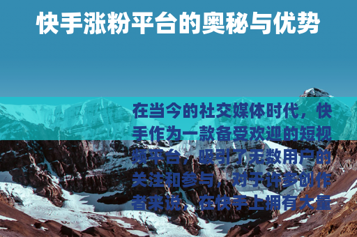 在当今的社交媒体时代,快手作为一款备受欢迎的短视频平台,吸引了无数用户的关注和参与,对于许多创作者来说,在快手上拥有大量的粉丝是他们追求的目标之一,而快手涨粉平台也应运而生,为创作者们提供了一种新的途径来扩大自己的影响力。