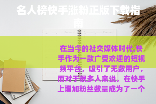 在当今的社交媒体时代,快手作为一款广受欢迎的短视频平台,吸引了无数用户,而对于很多人来说,在快手上增加粉丝数量成为了一个重要的目标,名人榜快手涨粉正版下载就备受关注。
