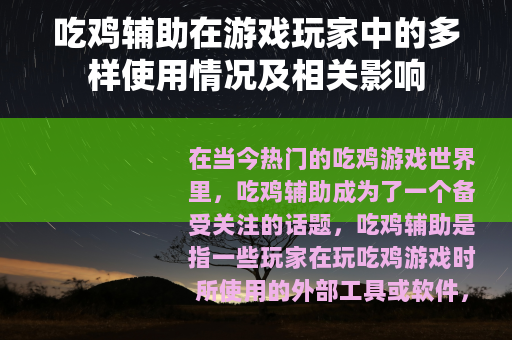 在当今热门的吃鸡游戏世界里,吃鸡辅助成为了一个备受关注的话题,吃鸡辅助是指一些玩家在玩吃鸡游戏时所使用的外部工具或软件,它们能为玩家提供各种各样的帮助,从而在游戏中获得更好的表现。